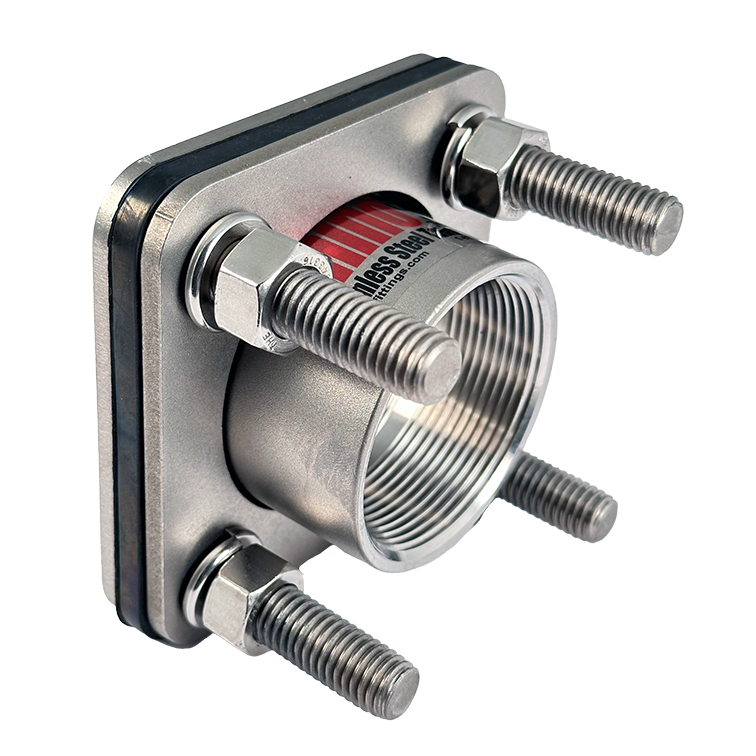 Rhino Full Coupling Tank Fittings feature Female National Pipe Thread and allow for a standard FPT connection both inside and outside the tank. Each fitting is made using precision tooling which guarantees 100% accuracy. Strict manufacturing standards and quality control procedures are followed during the manufacturing of every fitting. All Rhino fittings are laser cut from heavy duty type 316 stainless steel plate stock, robotically welded, have oversized 1/2" diameter studs and come standard with molded EPDM gaskets. Typical uses include water storage tanks, agricultural and chemical storage tanks, and numerous other mission critical tank and plumbing installations.